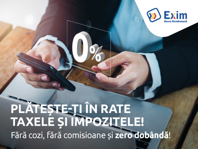 Exim Banca Românească lansează campania 'Plătește-ți taxele și impozitele în rate fără comision și cu zero dobândă'