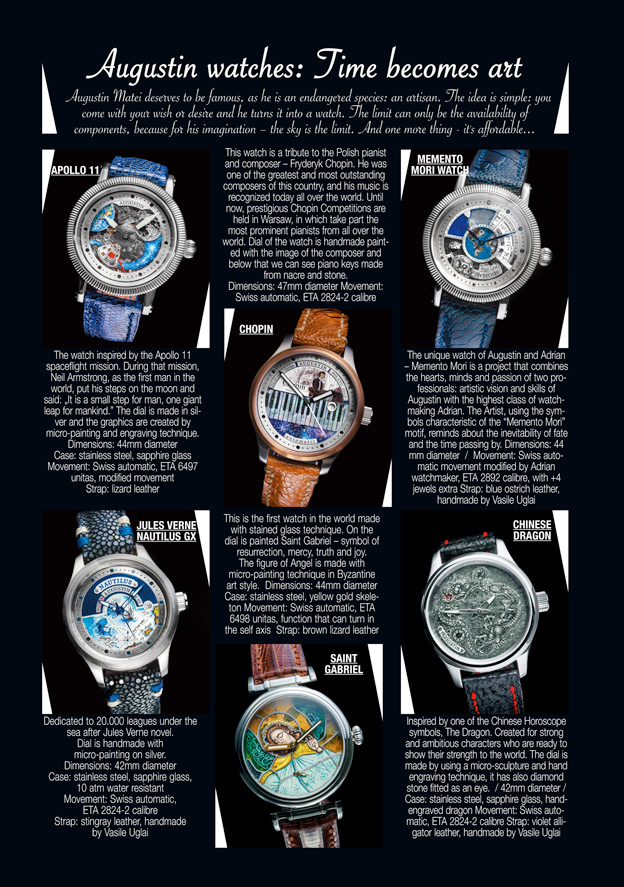 “I use different artistic expressions to create a unique touch, like a micro-sculpture, miniature painting, engraving techniques, etc.. And the result of my work is a watch that becomes a piece of art dedicated to you,” said Augustin Matei.